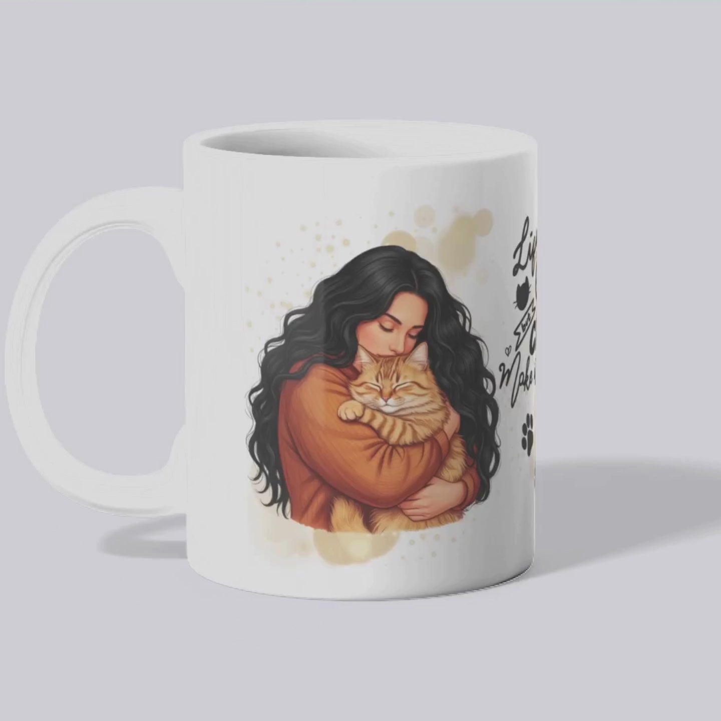 Cute 14oz mug with a picture of a woman holding a cat and the quote "Life is good but cats make it better"