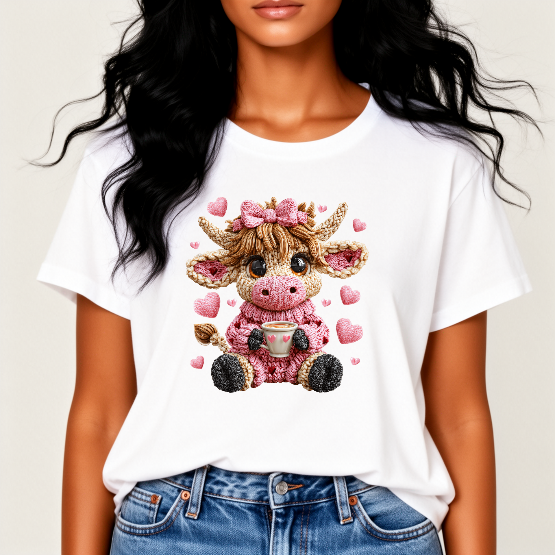 Cute Valentines Day T-Shirt with faux crochet Highland Cow holding a mug with hearts floating around.