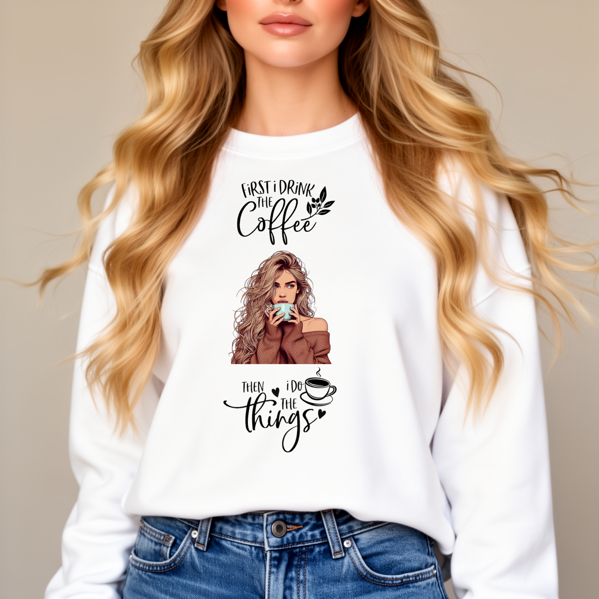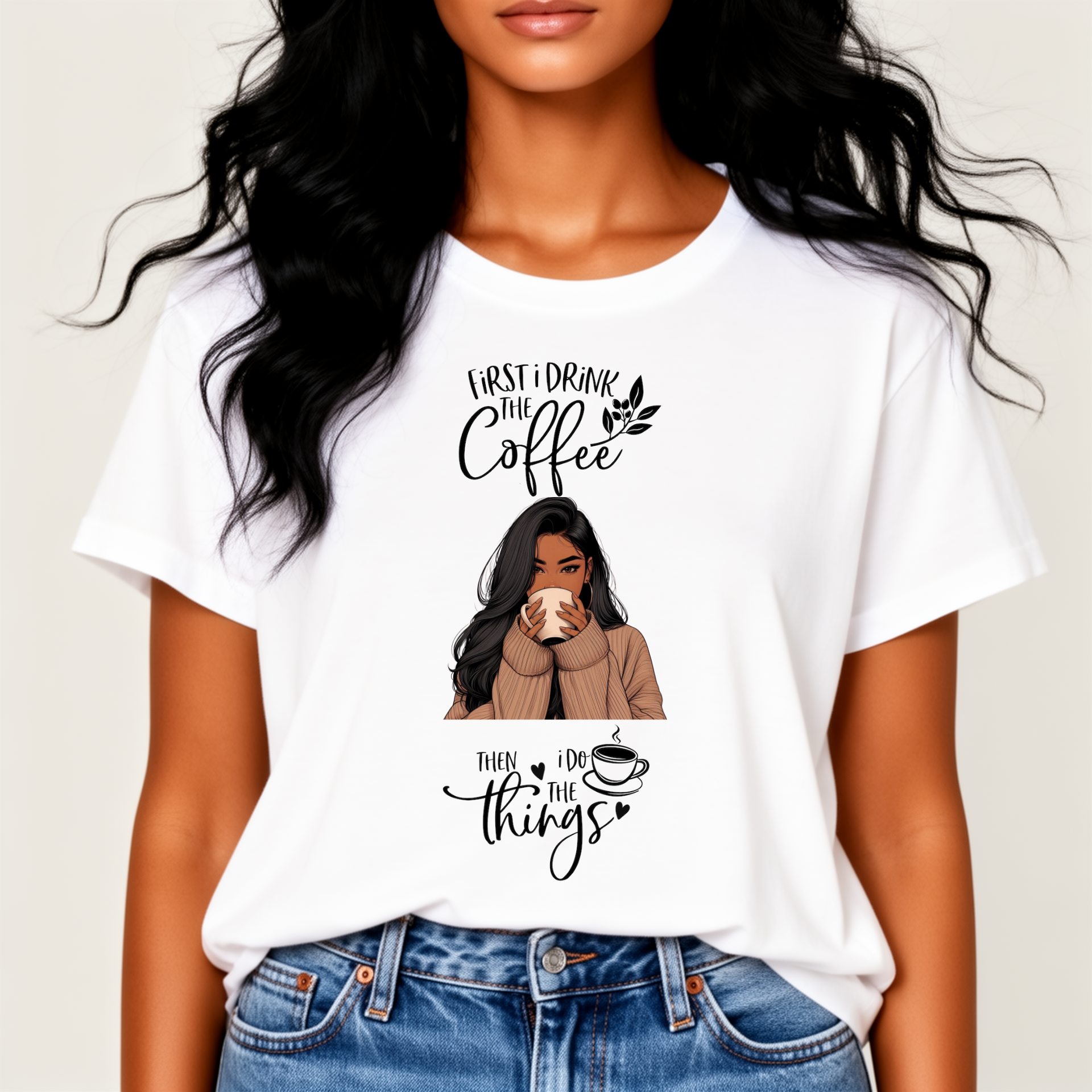 This is for all the coffee lovers! This cute top shows a woman enjoying a cup of coffee with the quote "First I Drink The Coffee, Then I Do The Things.