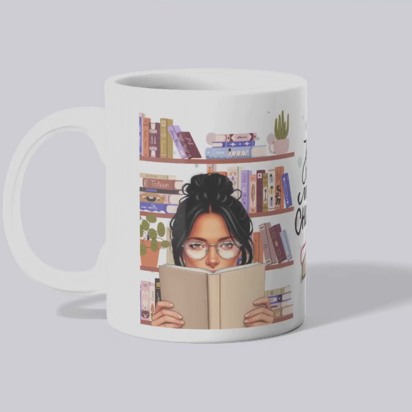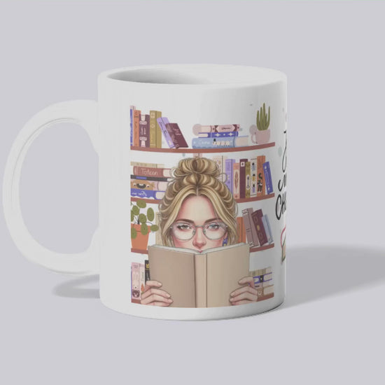 Cute 14oz mug with a pictures of books with little sayings on them.