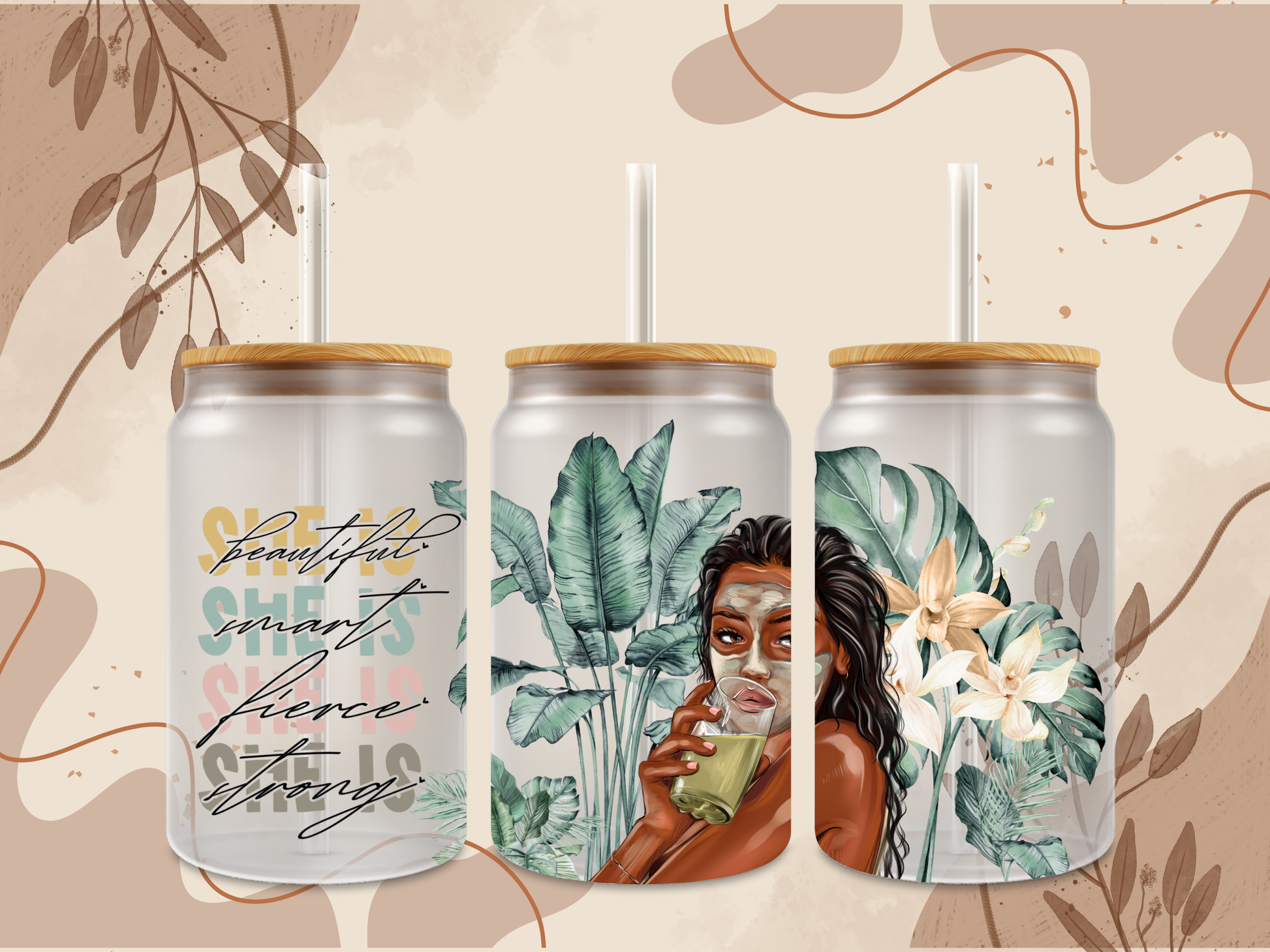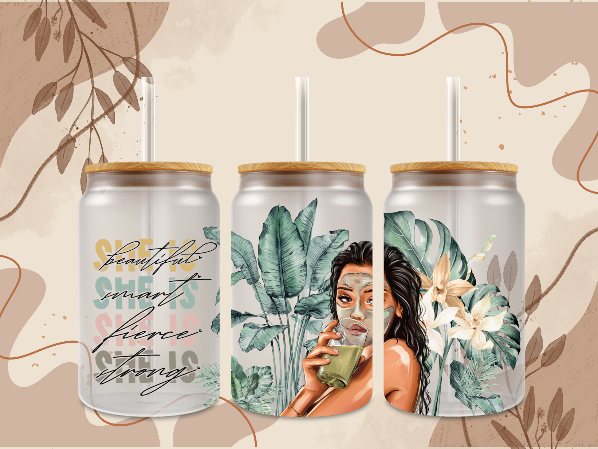16oz Glass Can with a woman in a mud mask with the quote "she is beautiful, smart, fierce, strong.