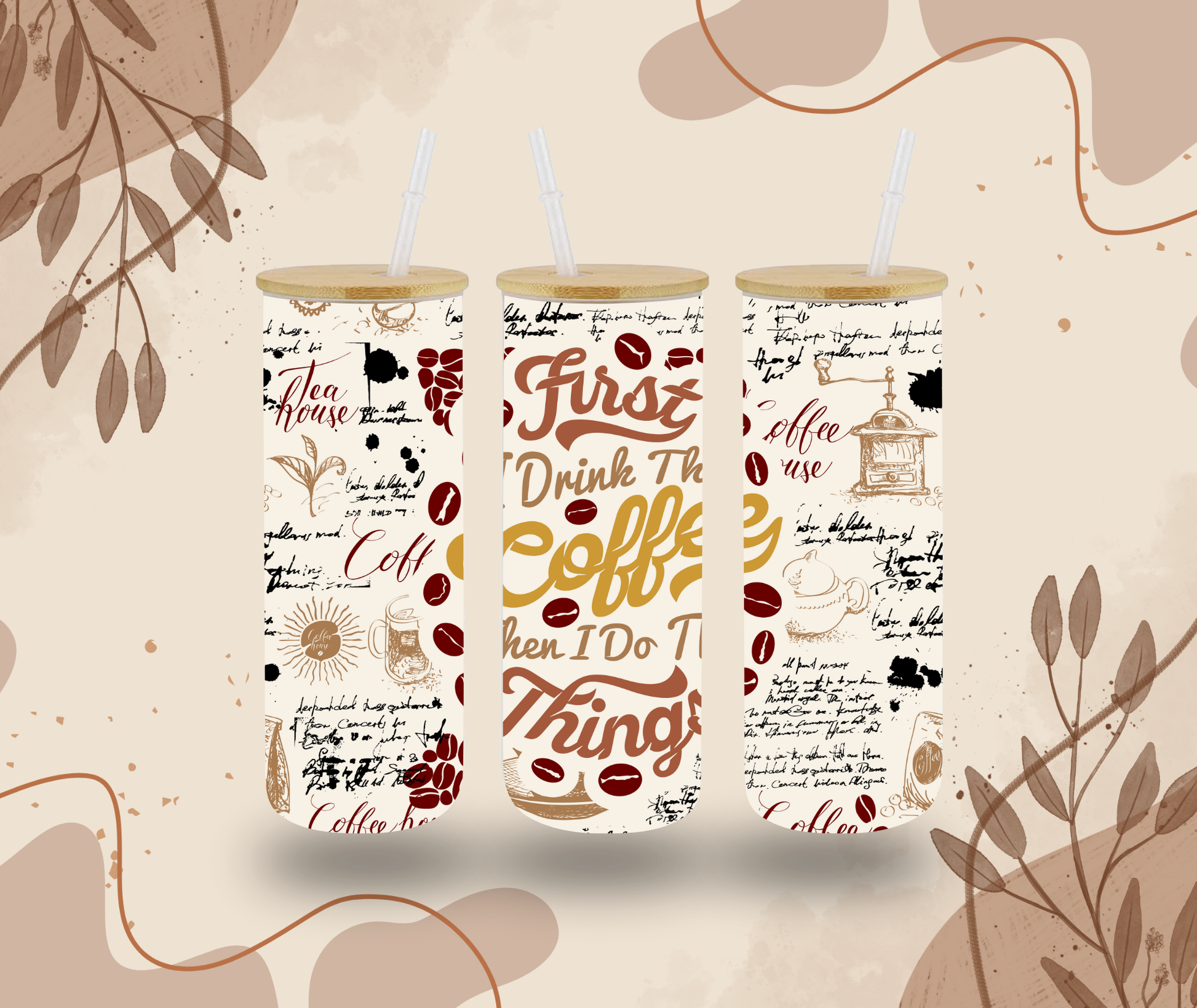 25oz Glass Can decorated the cute "First I drink the coffee, then I do the things" and coffee decorations