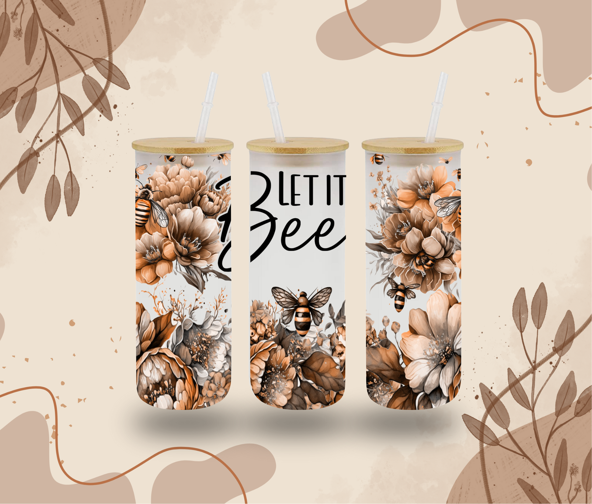 25oz Glass Can decorated with bees and flowers. With the quote "Let it Bee"